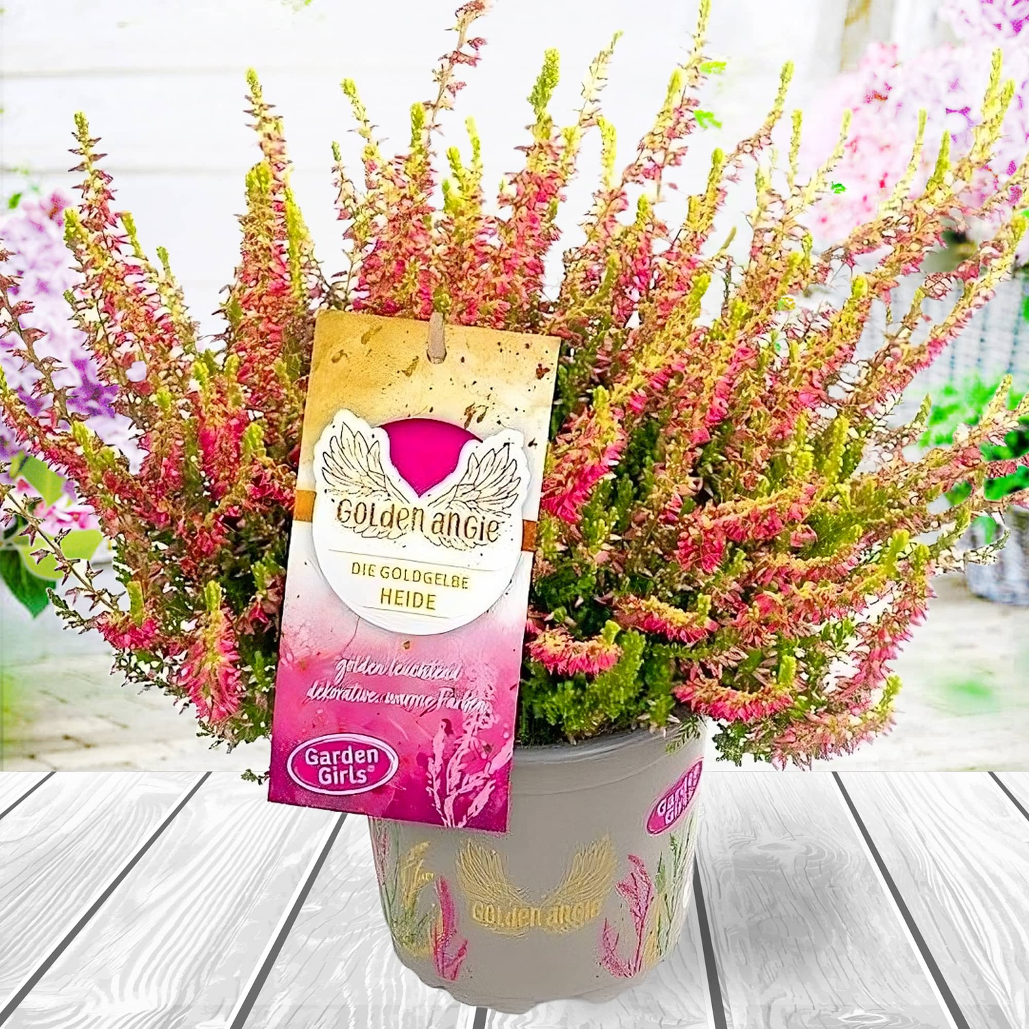 Skyline Golden Angie ist eine immergrüne Sorte, die das Beet das ganze Jahr über in Gold-, Gelb- und Rottönen erstrahlen lässt. Es ist kein Traum, sondern eine außergewöhnliche Skyline-Heide, die sommerlichen Glanz in jeden Garten bringt. Selbst an trüben Wintertagen wird es im Garten nicht an Farbe fehlen. Die Bezeichnung ‚flammende Heide‘ ist treffend, denn die Pflanze leuchtet in gelb-roten Farbtönen, die an ein loderndes Feuer erinnern.