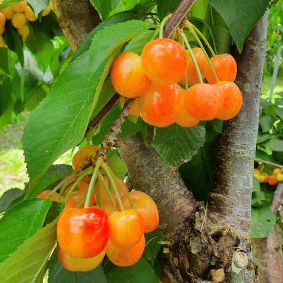 • Die Süßkirsche „Rainier“ ist eine außergewöhnliche Sorte mit goldgelben Früchten und einem feinen roten Schimmer. Die Früchte sind süß, saftig und selbst unter ungünstigen Bedingungen bruchfest. Die Sorte ist pflegeleicht und einfach anzubauen.