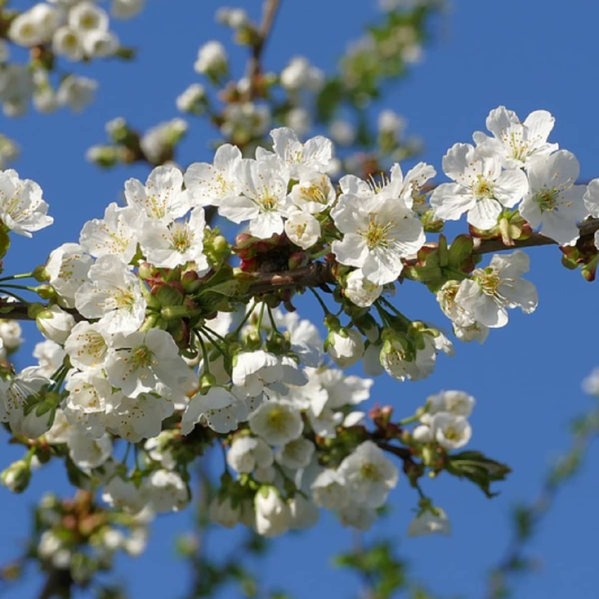 Die Süßkirsche Sam in Zwergform blüht mittelfrüh, meist zwischen Ende April und Anfang Mai. Im Frühling ist der Baum übersät mit zahlreichen weißen bis zartrosa Blüten, die einen feinen Duft verströmen. Die Blüten erscheinen häufig, bevor sich die Blätter vollständig entfalten, wodurch der Baum wie in weiße Watte gehüllt wirkt. Diese Sorte ist nicht vollständig selbstfruchtbar, daher wird empfohlen, sie in der Nähe anderer Kirschsorten mit ähnlicher Blütezeit zu pflanzen, etwa Van, Regina, Hedelfinger oder Burlat. Die Anwesenheit von Bestäubung durch Bienen und Hummeln fördert die Fruchtbildung und sorgt für gleichmäßige, hohe Erträge.