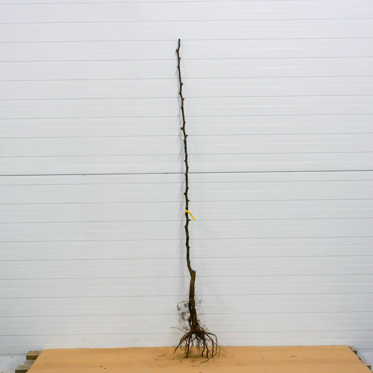 Die Süßkirsche ‘Stark Gold’ wächst schmal und aufrecht mit deutlich erkennbarem Leittrieb und zahlreichen Kurztrieben nahe am Stamm. Die Krone bleibt ohne starke Korrekturschnitte schlank; der Wuchs ist moderat — junge Bäume starten zügig, „schießen“ jedoch nicht in die Höhe. Unter üblichen Gartenbedingungen erreicht sie 2,5–3,5 m Höhe und 60–90 cm Breite; die Höhe lässt sich problemlos niedriger halten. Gleichmäßig verteilte Kurztriebe verbessern Durchlüftung und Belichtung, was Farbe, Glanz und Festigkeit der Früchte stärkt und Krankheiten vorbeugt. Der Ertragsbeginn ist früh (2.–3. Standjahr), die Fruchtbarkeit regelmäßig und reich. Das Laub ist gesund, dunkelgrün, und das schlanke Profil fügt sich ideal in moderne Pflanzkonzepte ein.