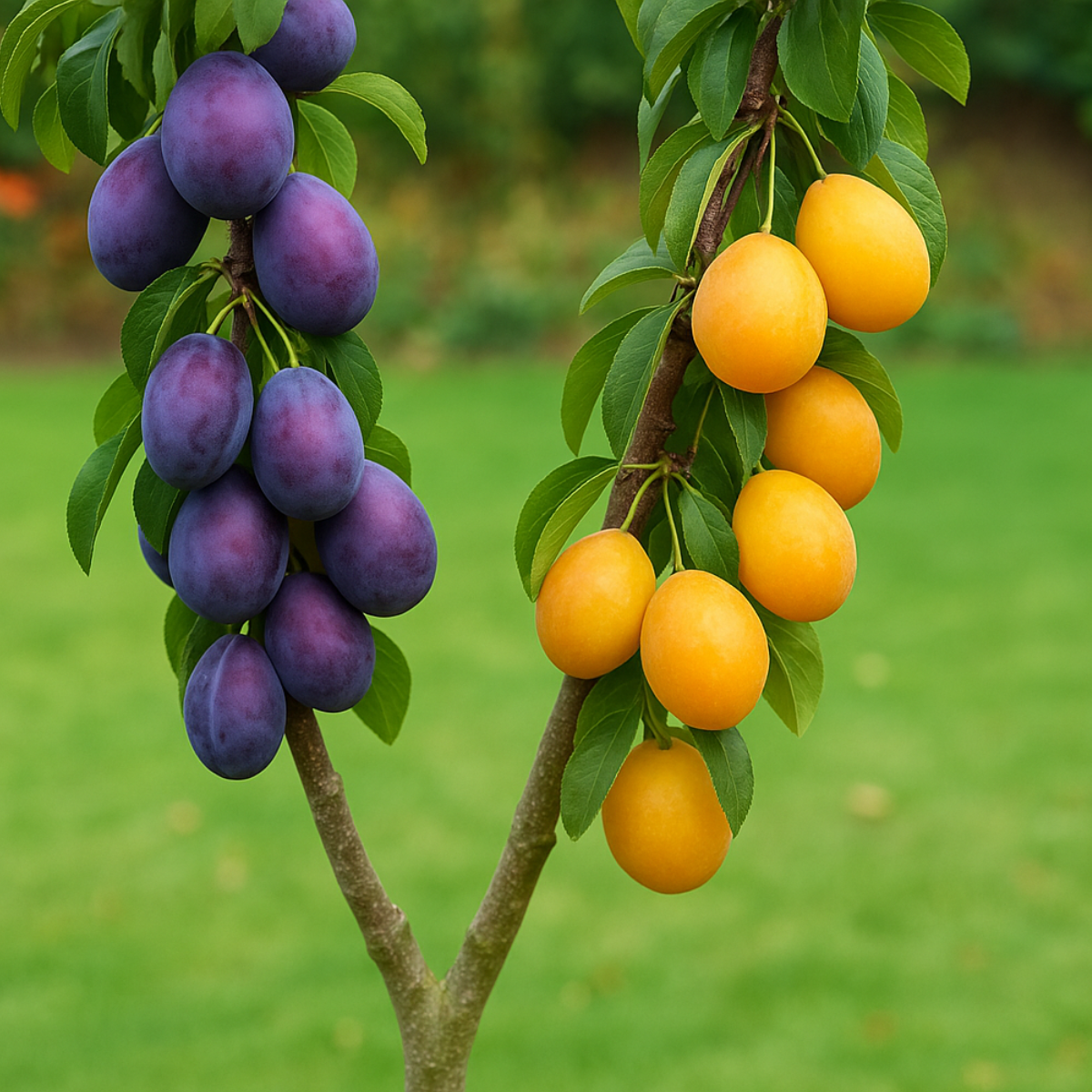 Die Kombination zweier klassischer Reineclauden auf einem Stamm vereint den edlen, aromatischen Charakter der ‘Althana’ mit der außergewöhnlichen Saftigkeit und honigsüßen Note der ‘Ulena’. Dieses Duo hat eine interessante Geschichte: Die ‘Reineclaude d’Oullins (Ulena)’, im 19. Jh. in Frankreich (Raum Lyon) popularisiert, wurde schnell zum Maßstab der Dessert-Reineclauden in Europa, während ‘Reineclaude Althana’ für ihren vollen, harmonischen Geschmack und die attraktive Röte geschätzt wird. Beide Sorten blühen zeitlich ähnlich und unterstützen sich gegenseitig, wodurch auf einem Stamm ein sicherer, regelmäßiger Ansatz entsteht. In kleinen Gärten ersetzen sie zwei Bäume und verlängern die Ernte: zuerst goldgelbe Früchte mit zartem Rouge (‘Ulena’), danach gelbe bis gelbgrüne mit komplexer, leicht erfrischender Note (‘Althana’).