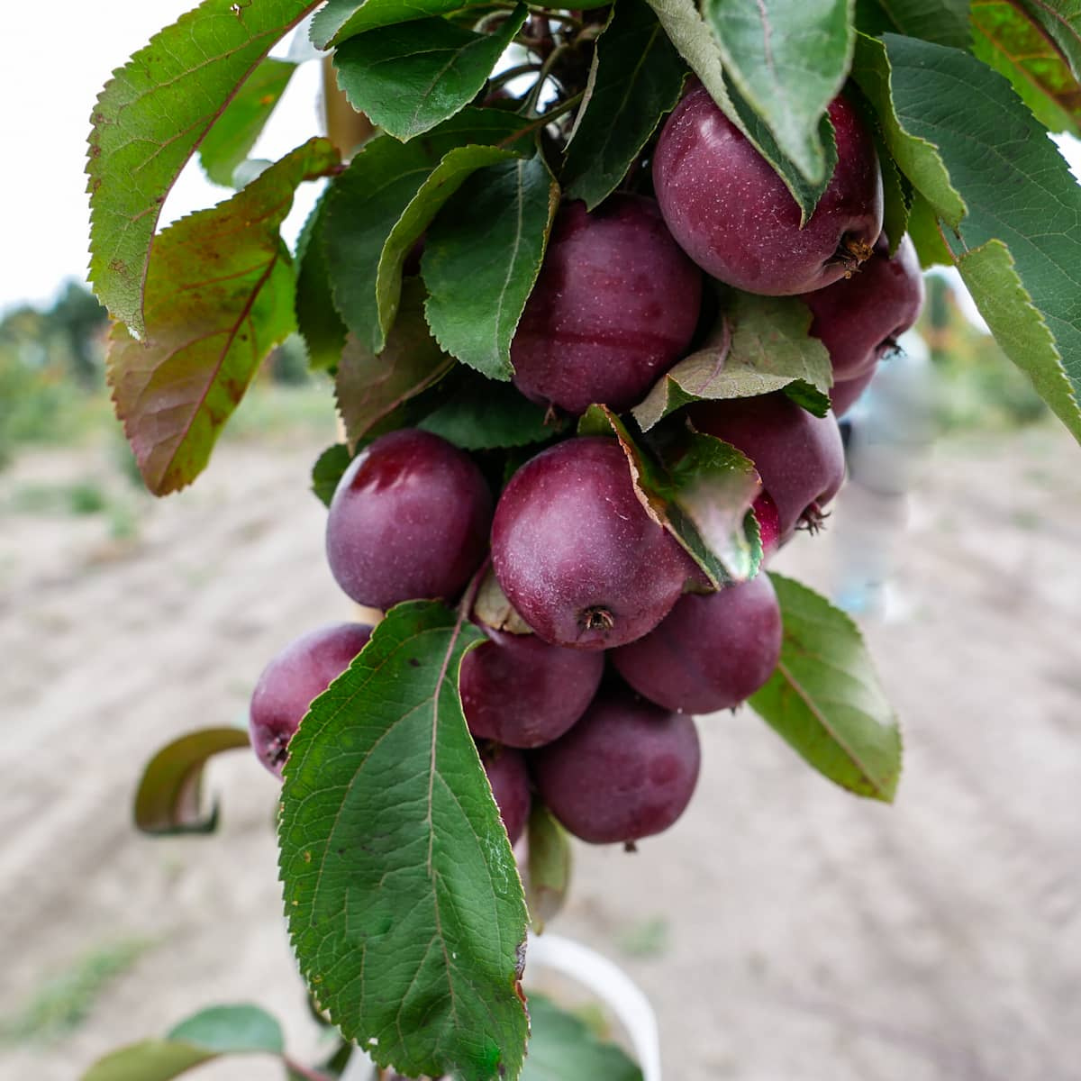 Der Apfelbaum wächst mittelstark und zeigt einen ausgeprägt säulenförmigen Habitus: Ein kräftiger, gerader Mitteltrieb wird von zahlreichen, stammanliegenden Kurztrieben begleitet. Der Platzbedarf der Krone ist gering und ermöglicht meterlange Spaliere selbst auf schmalen Gartenstreifen. Die Endhöhe eines ausgewachsenen Exemplars beträgt gewöhnlich 2–3 m bei etwa 50–80 cm Breite. Fruchttriebe sitzen nah am Mitteltrieb, sodass die Früchte eine dekorative „säulenförmige Girlande“ bilden. Dunkelgrüne Blätter mit leicht purpurfarbenem Schimmer kontrastieren mit Blüten und Früchten und verstärken den Ziereindruck über die ganze Saison. Die Formhaltung erfordert keine komplizierten Maßnahmen — meist genügen das Entfernen einzelner stark abstehender Triebe sowie ein behutsamer Kurztrieb-Verjüngungsschnitt im späten Winter oder sehr zeitigen Frühjahr.