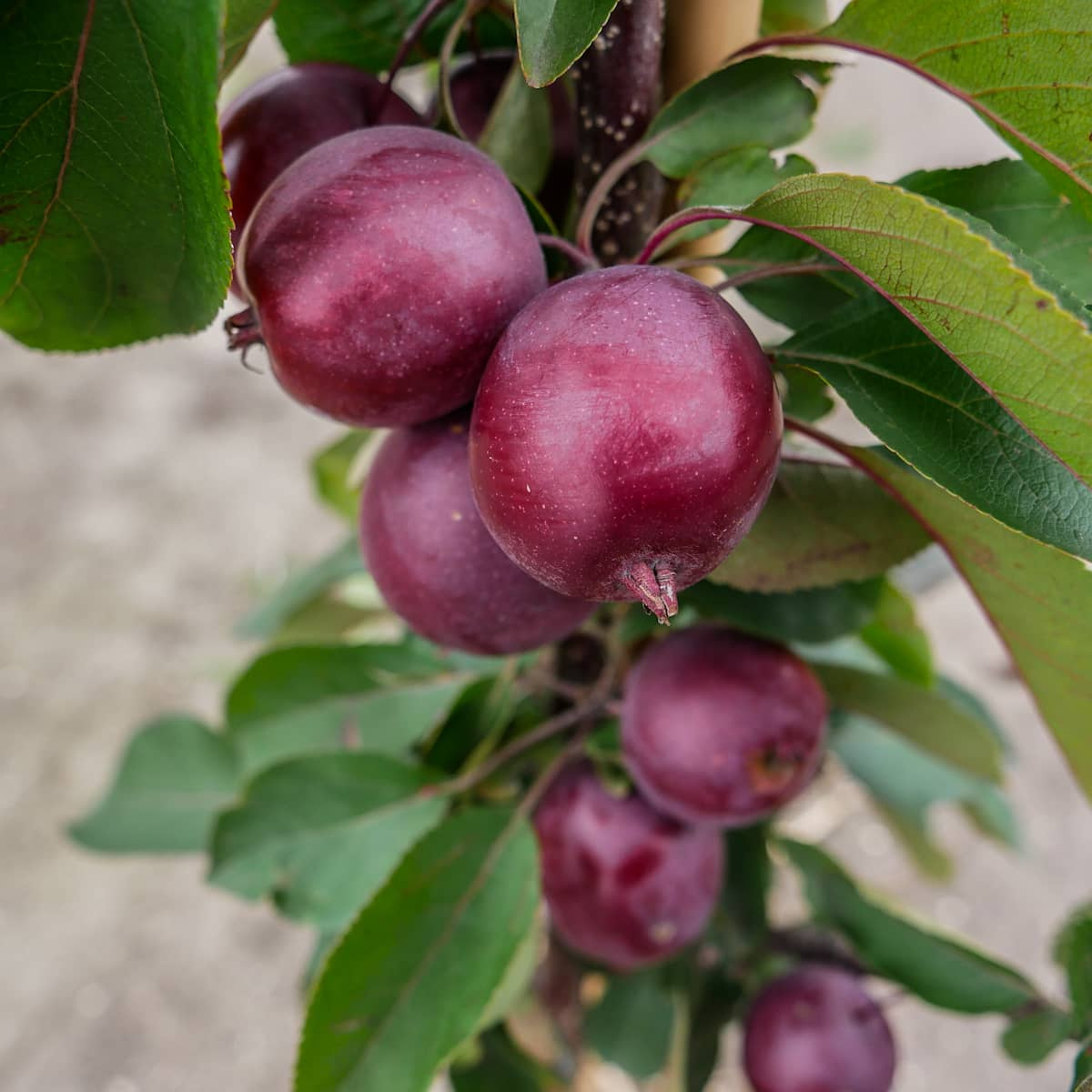 ‘Maypole Ballerina’ ist ein säulenförmiger Apfelbaum, der Zier- und Nutzwert vereint. Der schlanke, aufrechte Wuchs passt dorthin, wo klassische Bäume keinen Platz finden: in schmale Beete, entlang von Wegen, auf Terrassen und Balkone. Von Frühling an zieht die Sorte mit intensiv rosa-roter Blüte die Blicke auf sich, im Sommer bildet sie zahlreiche Kurztriebe, und im Herbst reifen reichlich dunkelrote Früchte mit gefärbtem Fruchtfleisch. Die Ernte liegt meist zwischen Ende September und Oktober; frisch verzehrt sind die Äpfel erfrischend, in Verarbeitungen geben sie eine natürlich rosig-rote Farbe. Eine Option, die saisonale Zierwirkung mit schmackhaftem, gesundem Ertrag auf kleinster Fläche verbindet — beliebt in Hausgärten und Anlagen mit Obstbäume.