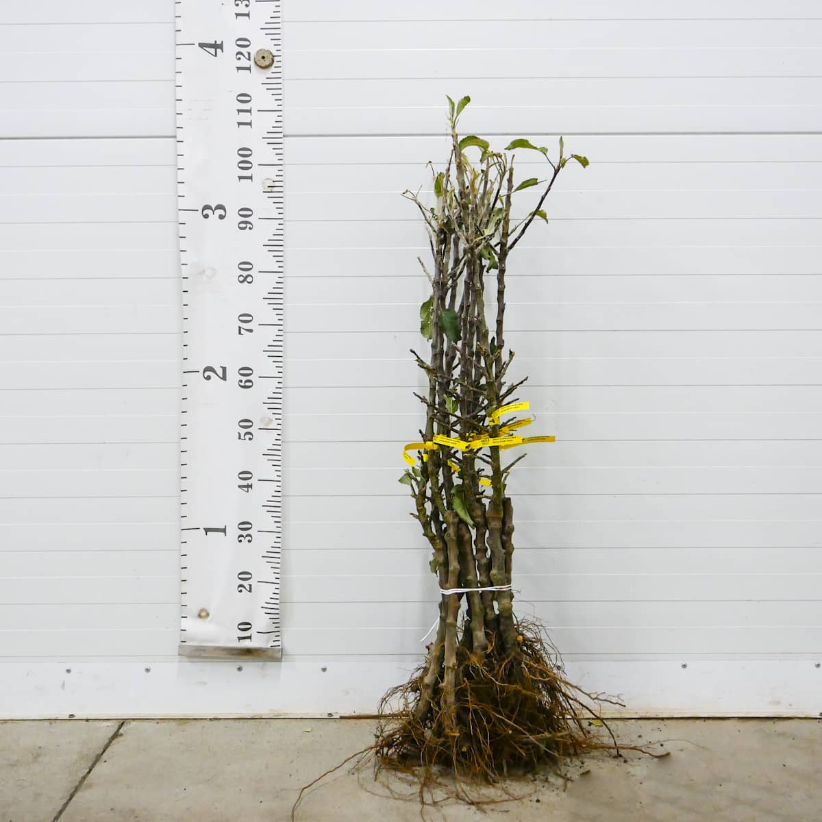 LaLambada wächst mittelstark und bildet eine aufrechte, ausgewogene Form. Sie erreicht eine Höhe von etwa 2,5 bis 3 Metern bei einer Breite von maximal 80 Zentimetern. Der Mitteltrieb ist stark und gerade, umgeben von zahlreichen kurzen Fruchttrieben, die gleichmäßig entlang des Stammes verteilt sind. Die hellgrünen, glänzenden Blätter sind regelmäßig geformt und verleihen dem Baum ein leichtes, elegantes Erscheinungsbild. Das Laub ist dicht, aber gut durchlüftet, sodass die Früchte ausreichend Licht erhalten, was ihre Farbe und ihr Aroma verbessert. LaLambada trägt früh – oft schon im zweiten Jahr nach der Pflanzung. Dank der schlanken Säulenform ist die Pflege besonders einfach und auch die Ernte gelingt bequem ohne großen Aufwand.