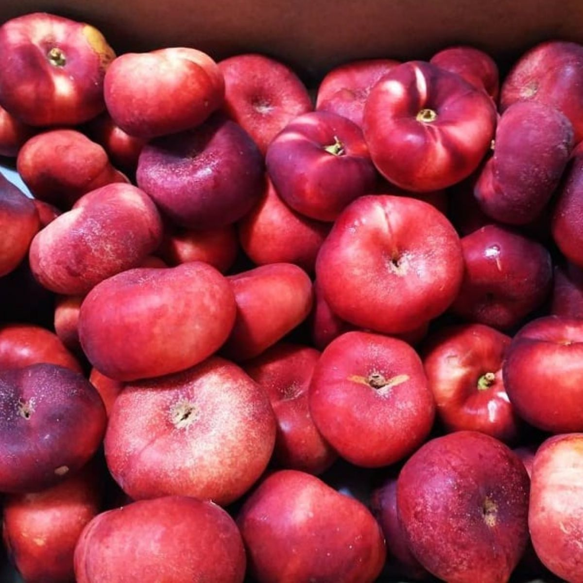 • Fruchtform – abgeflacht und rund, erinnert an sogenannte „UFO“-Pfirsiche, jedoch mit glatter, glänzender Schale, typisch für Nektarinen.